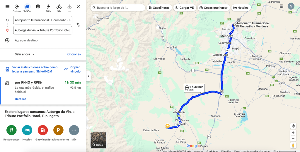 Como se ve en la imagen, llegar desde el aeropuerto hasta el hotel nos tomó 1 h 30, recorriendo aproximadamente 94 km.